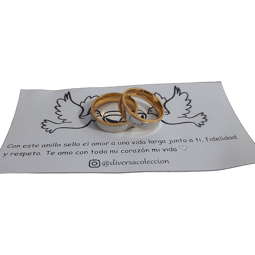 2 Anillos en acero de alta calidad, color plateado con bordes en interior dorado.